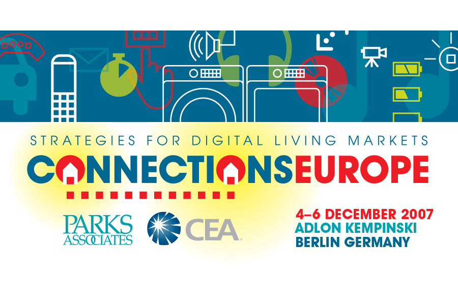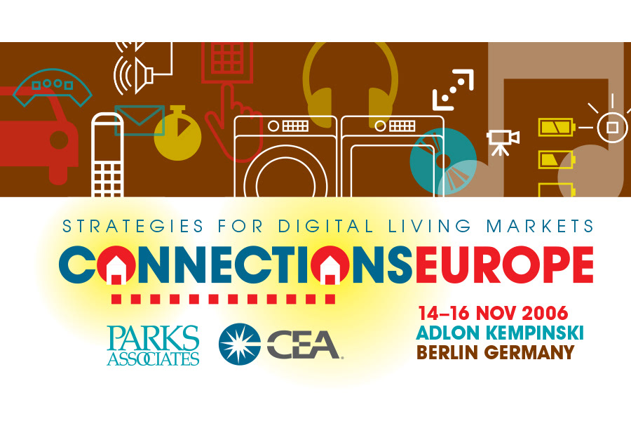 Due to its popularity the Parks Associates Connections™ conference expanded to European venues. The market research firm and CEA, the Consumer Electronics Association, co-sponsor an annual conference focusing on the rapidly changing residential technology market. The logotype is based on the US conference branding, and adds multi-layered illustrations.