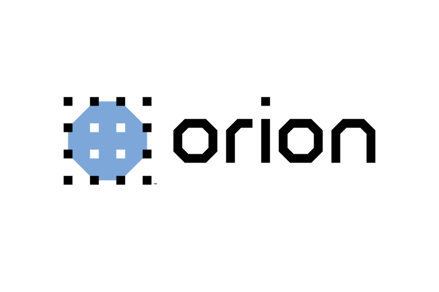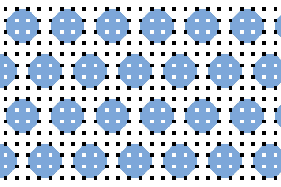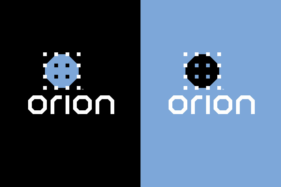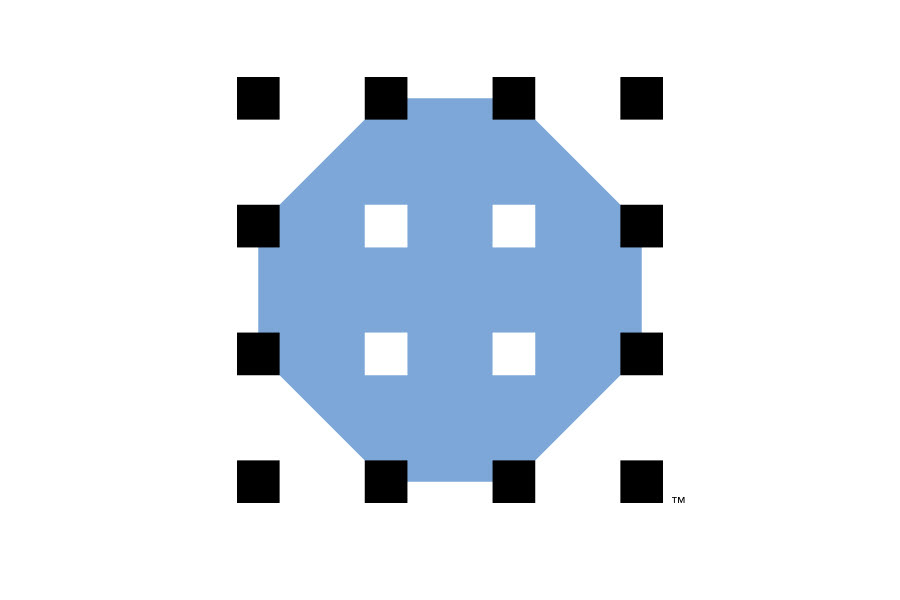 A color octagon is perforated by a grid of squares, suggesting a plan view of a construction drawing. The geometry continues with custom letterforms that reflect the symbol structure.